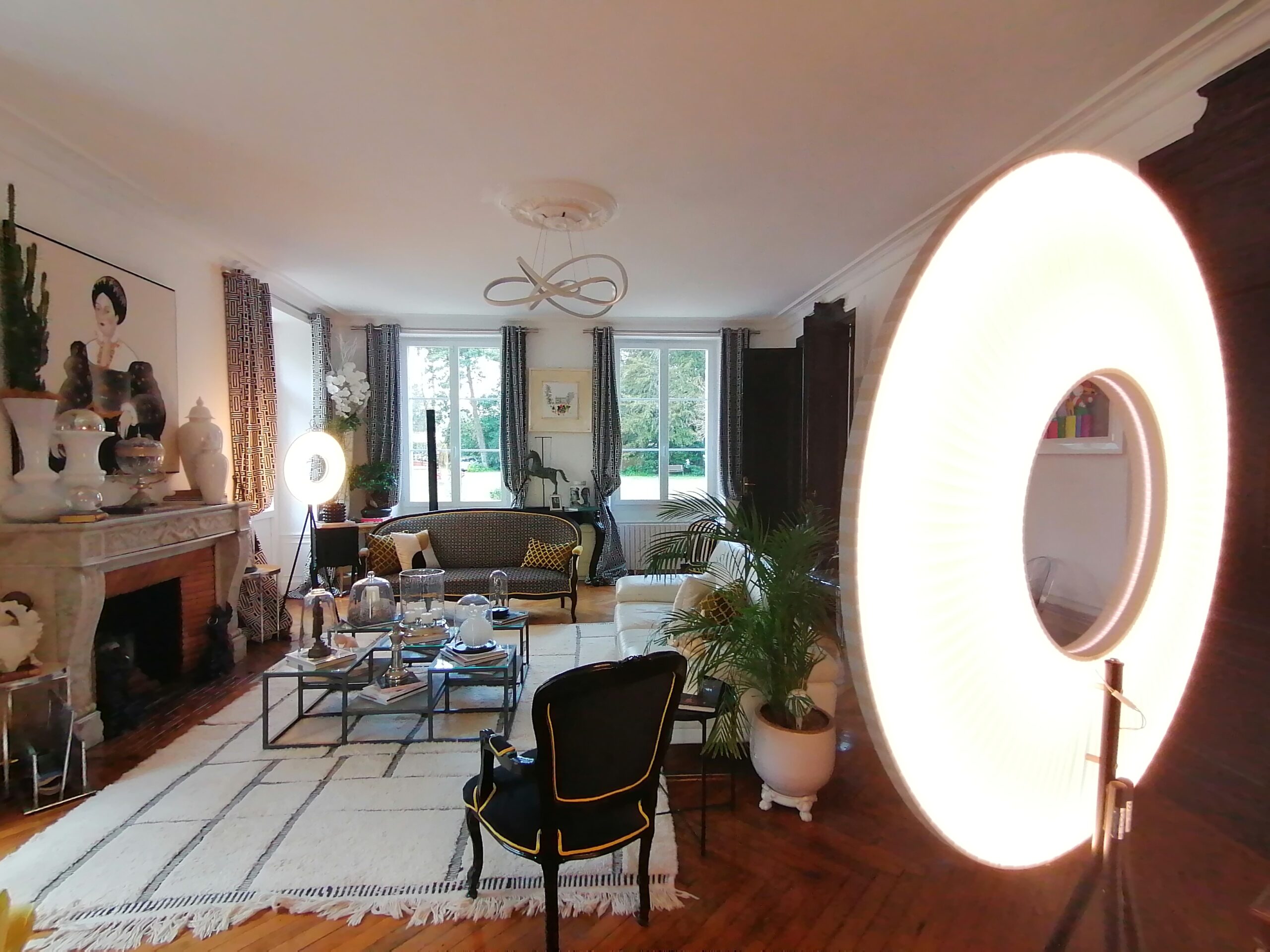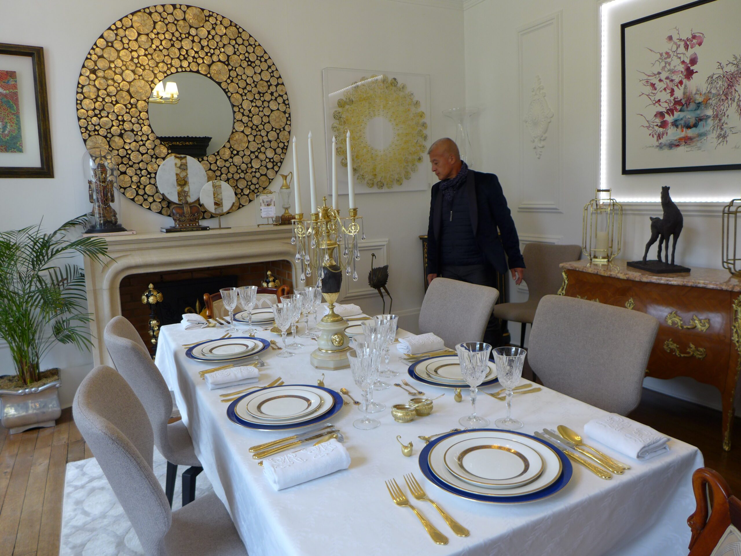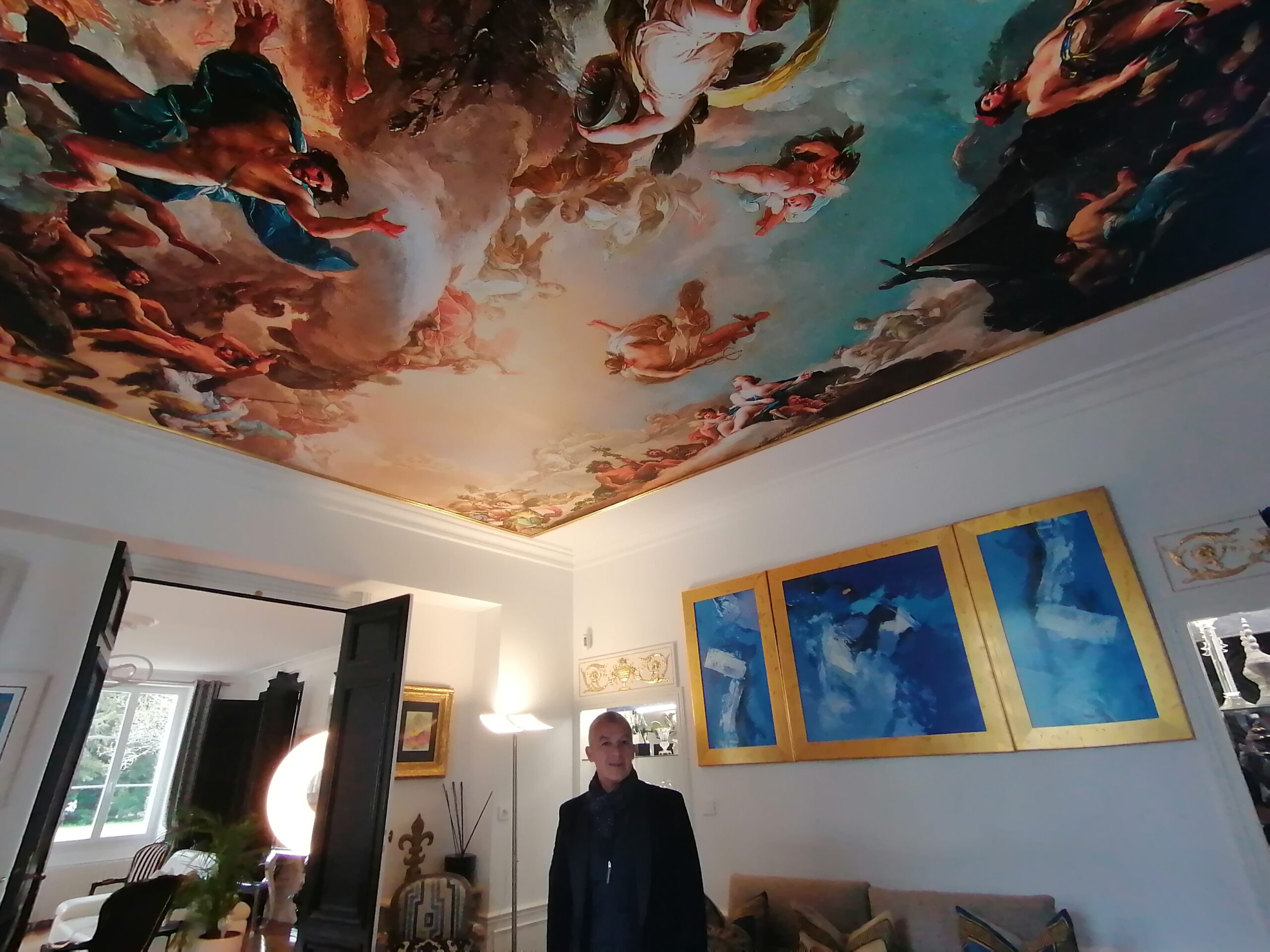 Ils ont passé plusieurs années à la rénover à leur goût, Roberto étant formé en restauration de mobilier à l’école Boulle. Ils ont choisi d’adopter le style napoléon III en le mixant avec différents styles. Par exemple, au plafond d’un salon, se trouve une reproduction d’une grande scène épique qui vient du musée du Prado à Madrid. Les parquets ont dû être débarrassés des anciennes moquettes, avant d’être traités avec des litres d’huile de lin. Ils sont désormais impeccablement cirés. Il a fallu tout remettre aux normes de sécurité et de confort, de la centaine de prises électriques à une quarantaine de fenêtres à double vitrage réalisées sur mesure.