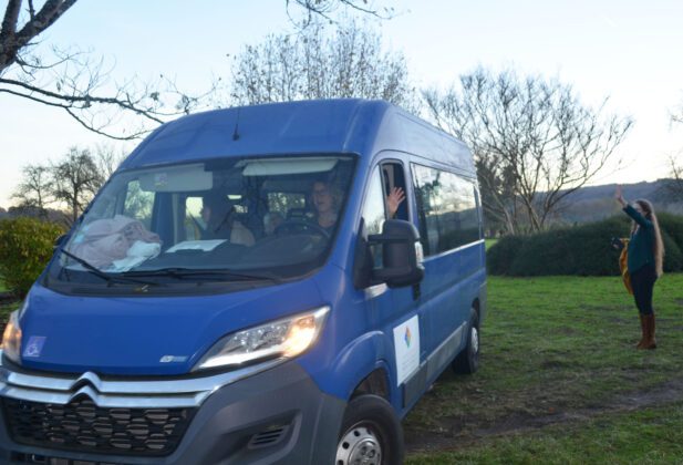 La sortie se fait avec le minibus acquis grâce à l’opération pièces jaunes des Hôpitaux de France qui a financé la moitié de cet achat réalisé par l’Ehpad. « Depuis huit ans que nous l’avons, nous sortons régulièrement pour des animations hors les murs : au cinéma, au musée La rue du temps qui passe, à Lascaux… « Aujourd’hui, elles sont deux pour encadrer la balade, Liliana et Maeli, en stage auprès d’elle.