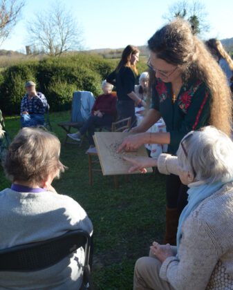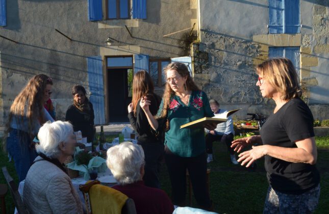 Sophie et son compagnon Julien, sa fille Cassandre, sa mère et des amis ont préparé un goûter durant lequel un livre d’or a été ouvert pour l’union d’un aîné et d’un arbre : Jeanne a choisi un paulownia, Éliane un arbre à clochettes, René un mûrier platane, Liliane un chêne, Claude un liquidambar, Anne-Marie un tulipier de Virginie. « Les résidents ont apporté des boutures qu’ils ont préparées et des divisions de vivaces et, de notre côté, nous avons acheté les arbres qu’ils ont plantés. » Et qui grandiront dans la vallée de la Dordogne, entre Saint-Cyprien et Beynac. Et qui leur survivra. « C’est dans l’esprit de tout ce qu’on a prévu ici, poursuit Sophie. Un p’tit village dans le village, pour un maximum d’interactions entre toutes les générations. » Planter, faire pousser, cueillir… René a déjà mis des arbres en terre quand il était cantonnier pour la ville de Sarlat, après avoir été plâtrier et manœuvre maçon. Lui et les autres résidentes ont savouré cette sortie, et fait remonter des chansons oubliées, en occitan, reprises en chœur en repartant.