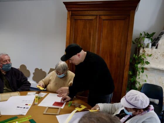 Dix résidents motivés de l’Ehpad des deux Séquoias, accompagnés de Magali, de Véronique, et de Lola, ont participé à l’un des ateliers, sous la houlette de l’artiste attentif à tous et à chacun.