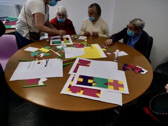 Des dizaines d’artistes de 7 à 100 ans se sont ainsi succédé du 21 au 25 mars dernier pour apporter leur contribution créative. Munis de dés, de ciseaux, de colle, de feuilles de différentes couleurs et de formes en bois, ils ont appliqué les différents protocoles conçus et préparés par Eltono. Tel numéro suite au jet du dé correspondant à telle couleur, à telle forme, le hasard décidant de la composition finale.