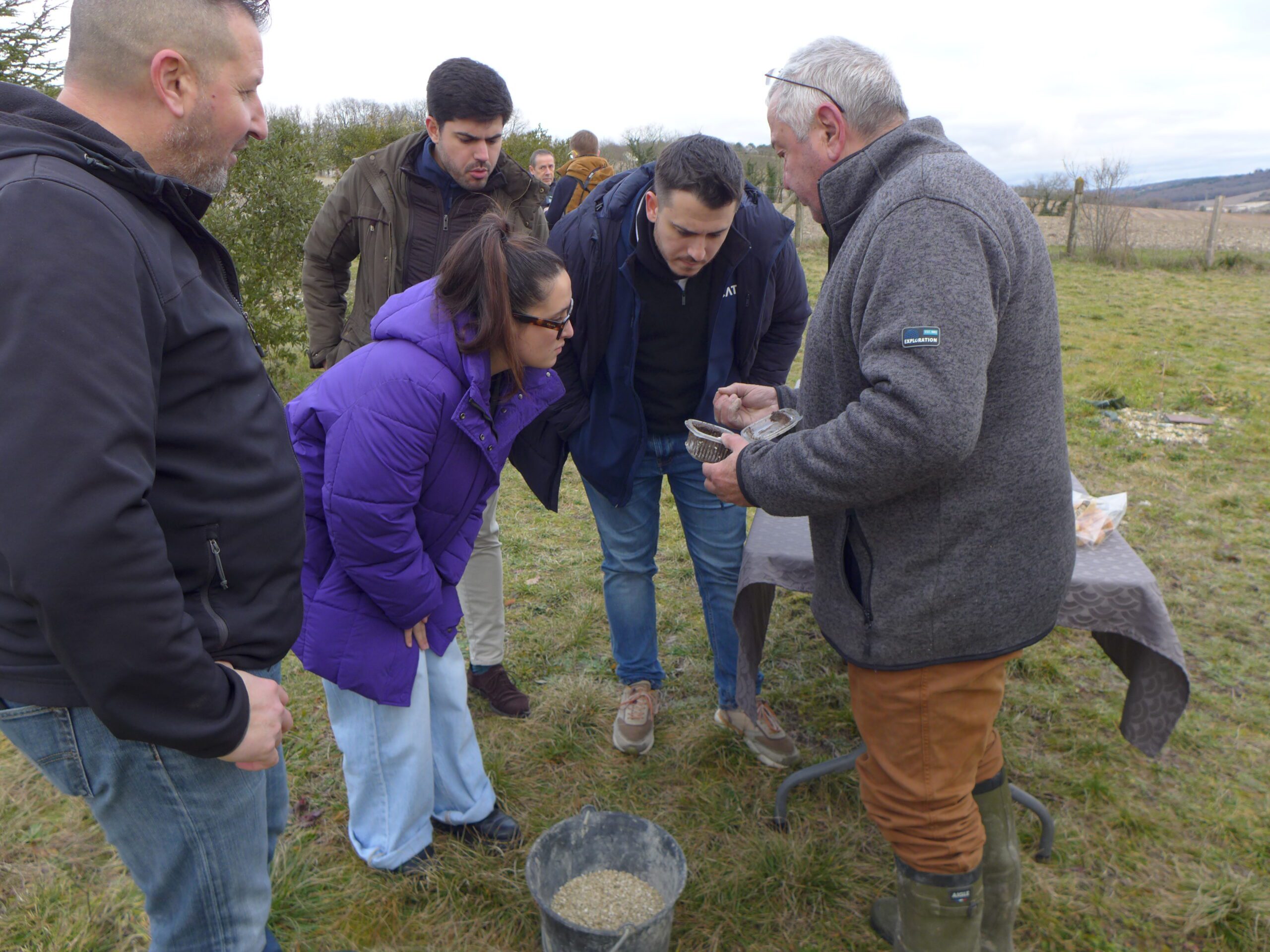 Serge Sauve, agriculteur retraité et trufficulteur passionné, a accueilli le groupe en partageant son savoir-faire : « J’ai appris la trufficulture en parlant avec les anciens et en observant la nature ». Depuis une vingtaine d’années, il a planté des centaines d’arbres qu’il entretient avec du matériel récupéré et adapté : une minipelle pour le sol, une citerne d’eau pour arroser l’été, un mélangeur pour préparer le réensemencement indispensable des arbres, avec de la vermiculite et des spores de truffes, un taille-haie pour les grosses tailles…