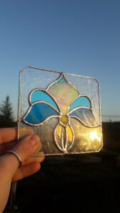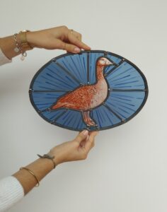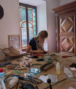 Là, au détour d’un atelier, elle rencontre le vitrail et c’est le coup de foudre. Une rencontre décisive est venue amplifier cette vocation naissante : Didier, son professeur au sein de l’association, c’est lui qui, avec patience et bienveillance, a su réveiller en elle ce lien profond avec l’art, cette émotion singulière qui naît quand la matière se met à vivre entre les mains. « Il m’a transmis bien plus qu’un savoir-faire, raconte-t-elle, il m’a donné le goût du geste juste, de la lumière, du détail. » Le vitrail, cet art subtil qui marie le verre, le plomb, la couleur et la lumière, devient sa révélation. « J’ai su tout de suite que c’était ça », confie-t-elle. Dans ses mains, la transparence du verre prend vie, se transforme en poésie lumineuse.
