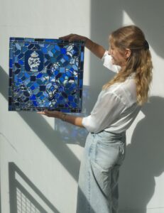C’est aussi un patient travail de coloriste, où Florine laisse parler sa passion pour le bleu, cette teinte qu’elle aime plus que toute autre. Tout commence avec la maquette, pensée comme une véritable composition picturale : on y pose les couleurs, les équilibres, les nuances. Puis vient le moment décisif du choix du verre. Là, il faut savoir se projeter, imaginer l’effet de la lumière, anticiper ce que chaque teinte, chaque transparence racontera une fois traversée par le jour. « C’est un gros travail ! », sourit Florine, consciente de la minutie que cela demande.