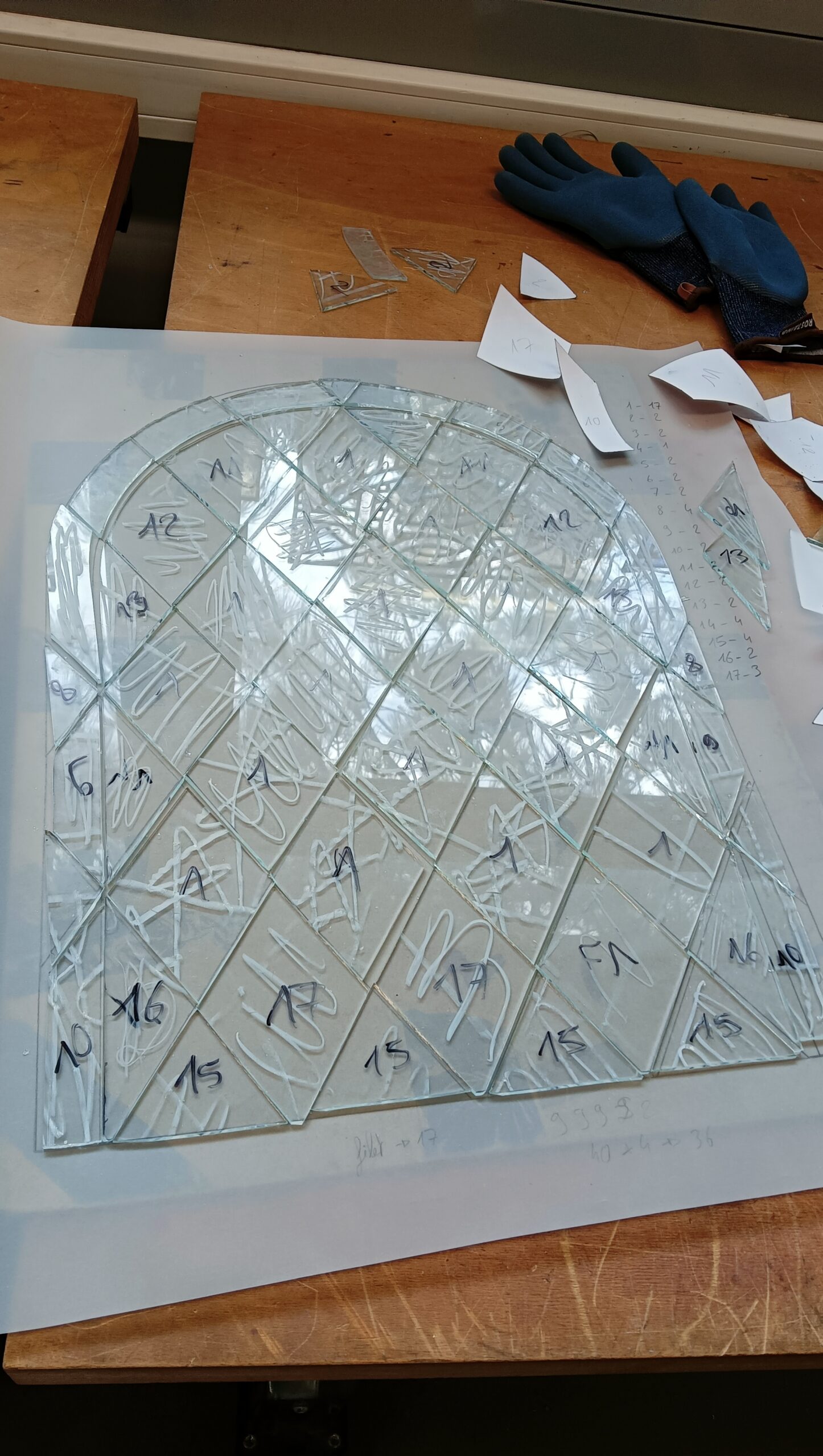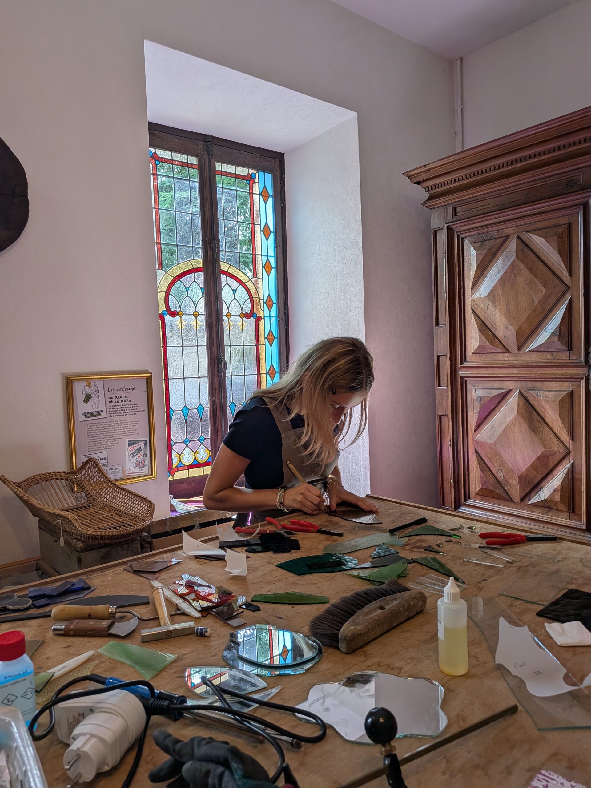 C’est aussi un patient travail de coloriste, où Florine laisse parler sa passion pour le bleu, cette teinte qu’elle aime plus que toute autre. Tout commence avec la maquette, pensée comme une véritable composition picturale : on y pose les couleurs, les équilibres, les nuances. Puis vient le moment décisif du choix du verre. Là, il faut savoir se projeter, imaginer l’effet de la lumière, anticiper ce que chaque teinte, chaque transparence racontera une fois traversée par le jour. « C’est un gros travail ! », sourit Florine, consciente de la minutie que cela demande.