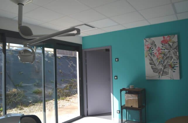 C’est donc finalement un trio professionnel qui se laisse séduire par un local vacant, au prix plus raisonnable que l’immobilier de la ville centre. « Noémie habite Atur, ses deux enfants y sont scolarisés et, au hasard d’une conversation, elle a eu connaissance de cette opportunité. » Une partie était encore occupée par le kiné qui a bien voulu se décaler d’un cran dans cet alignement d’espaces de plain-pied, si bien que la superficie idéale était disponible. « On a eu le coup de cœur, il n’y a pas de vis-à-vis, l’ensemble est très lumineux, calme, tout favorise la concentration. » Le cabinet est ouvert depuis septembre 2019, après près de cinq mois de travaux réalisés sur mesure, l’installation de cabinets dentaires nécessitant un important passage de réseaux au sol. Chacune a choisi la couleur dominante de son environnement, des tons acidulés turquoise ou framboise bons pour le moral des patients et le cadre de vie de tous, trois assistantes et une femme de ménage y travaillant aussi. « Nous y passons beaucoup de temps et on a bien l’intention de rester. »
