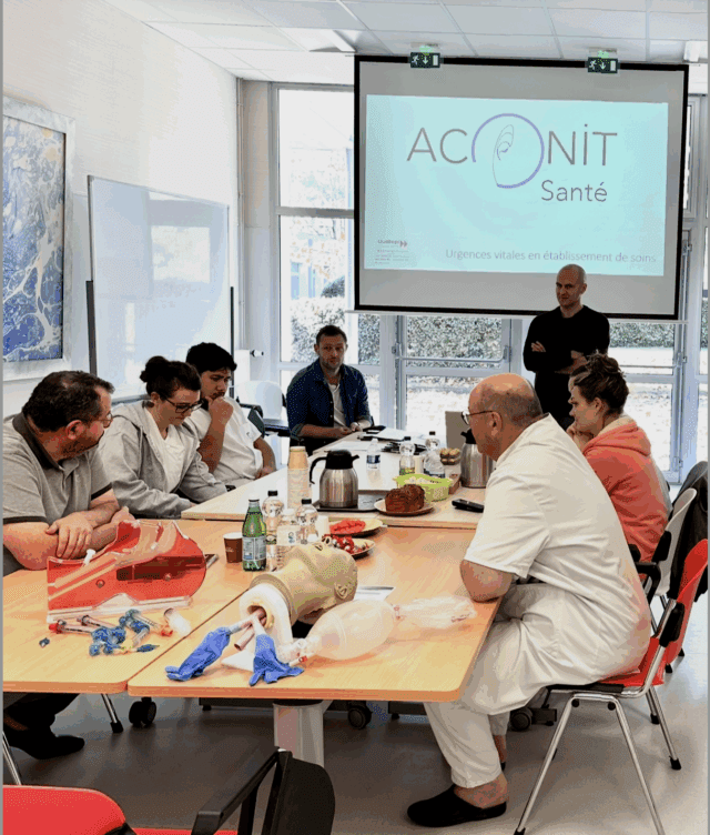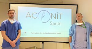 Aconit, cette fleur de montagne entre dans la fabrication de produits d’anesthésie. La signature choisie dit bien d’où viennent les créateurs de cette entreprise de formation. Deux infirmiers anesthésistes en poste à l’hôpital privé Francheville, Aymeric Fardel et Laurent Germain, ont eu l’idée d’ajouter à leur parcours de soignant une dimension de transmission, ceci après que la période Covid les a mis en présence d’organisations différentes, celles d’autres services de la clinique et en renfort au centre hospitalier de Périgueux. L’occasion d’échanger des compétences, de diffuser des savoir-faire en interne, de rencontrer des pairs. « À la suite de ça, on s’est dit qu’il fallait renforcer la formation, parce que c’est un rempart magnifique contre les burn-out et les carrières courtes… La durée d’exercice d’une infirmière se réduit de plus en plus, elles arrêtent par épuisement et diverses raisons. »