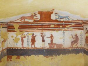 Christian Chevillot, docteur en archéologie, est intarissable sur les relations entre Gaulois et Étrusques. Son dernier voyage a amené des amateurs d’archéologie et de découvertes sur quelques-uns des sites majeurs. Bien sûr, il y avait l’incontournable cité de Tarquinia avec sa nécropole de tombes souterraines comportant les plus belles tombes peintes étrusques. Dans son musée archéologique, se découvrent de fabuleuses collections d’objets trouvés dans les tombes fouillées depuis des siècles. Énormément de vases grecs rappellent des origines et des liens très forts entre l’Étrurie et la Grèce, depuis le IXe siècle avant notre ère. Ils font encore partie des mystères de cette civilisation très différente de celle des Romains qui les ont remplacés.