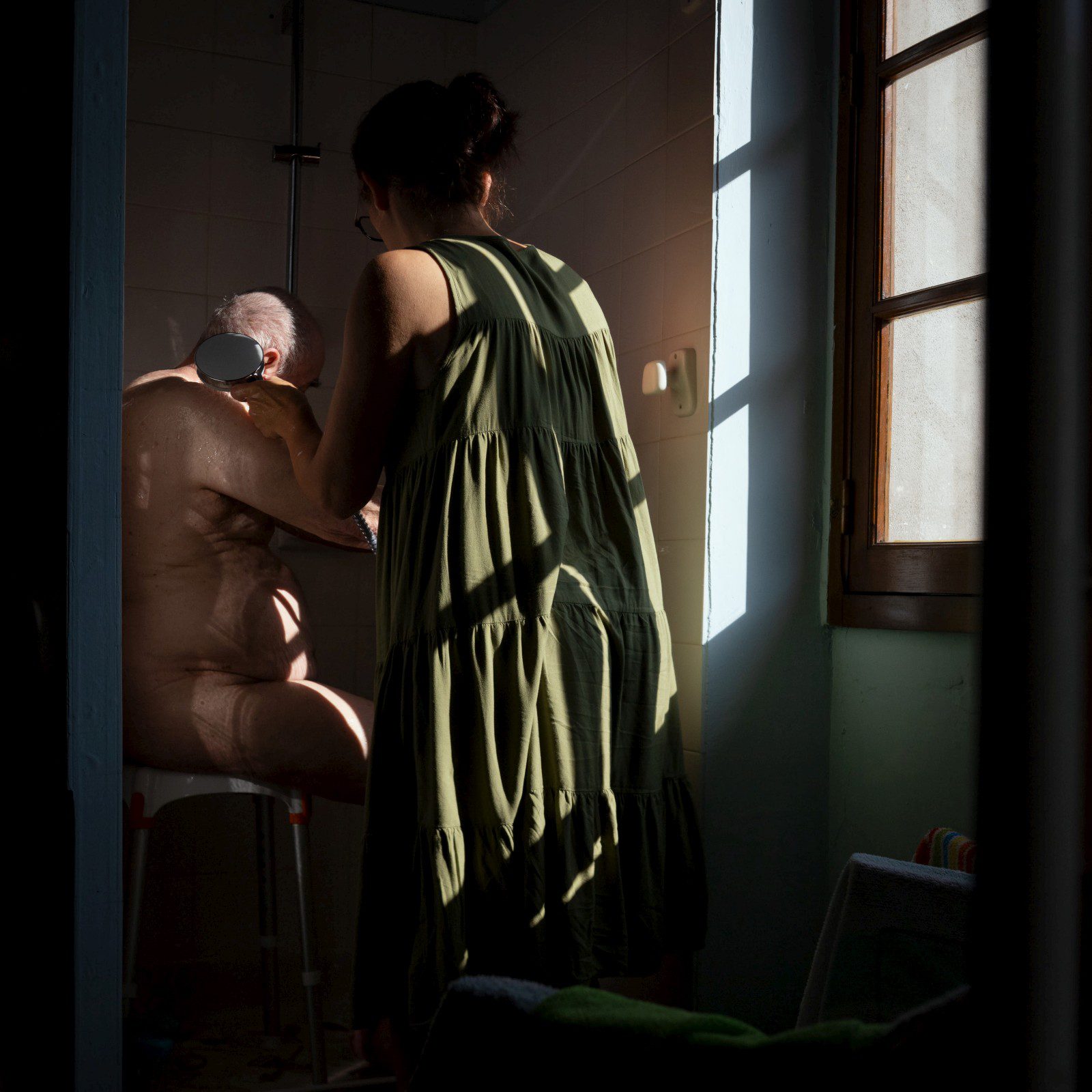 Vincent Gouriou, qui vit à Brest, a été accueilli par le centre intercommunal d’action sociale du Val de Dronne, qui s’occupe de personnes âgées avec des aides à domicile. Il a travaillé dans leur intimité en clair-obscur, mettant en scène des duos entre aidants et aidés.