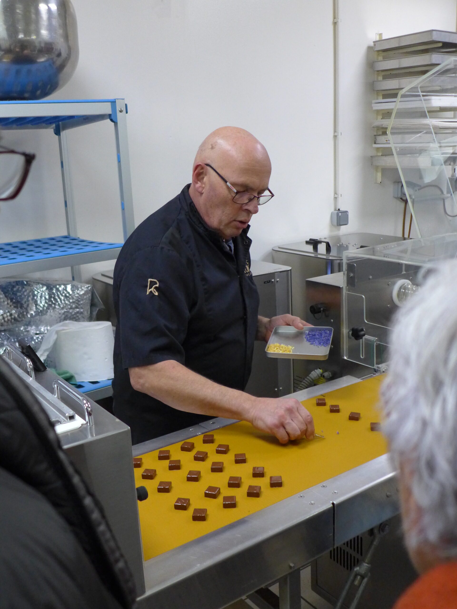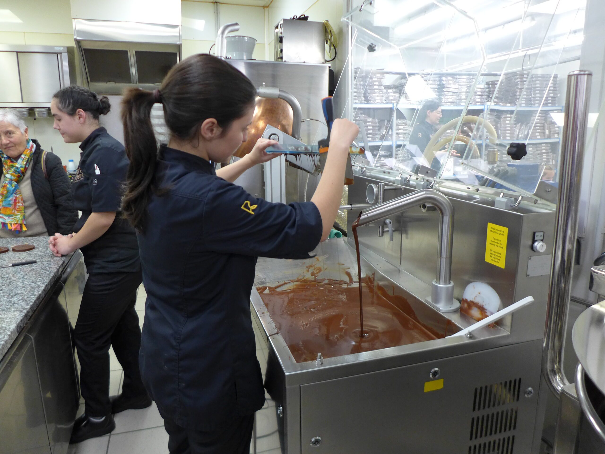 Les portes ouvertes, chaque année en novembre, sont l’occasion pour des centaines de visiteurs (450 cette année) de découvrir ce procédé et de goûter le résultat au fur et à mesure. Le week-end des 15 et 16 novembre, toute l’équipe de la chocolaterie était mobilisée pour ces démonstrations dans l’atelier. Se retrouver entre les machines et sentir les arômes en cours de fabrication, cela vaut mieux que tous les salons du chocolat. Chacun pouvait goûter les différentes origines par pays et comprendre les fabrications. L’impressionnante machine à enrober des bonbons au chocolat comprenant du praliné ou de la ganache maison, permet de voir le travail minutieux mené sur chaque pièce. Plus loin, le moulage des chocolats de Noël, le grand moment de l’année avec Pâques, rappelle l’aspect artisanal de cette production.