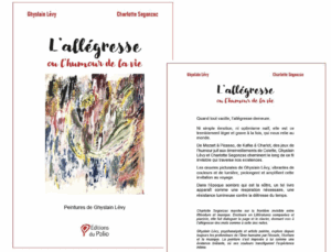 L’allégresse s’écrit et se peint aussi. Les tableaux viennent enrichir l’ouvrage d’un autre langage : « ils ne sont en rien des illustrations du texte, mais ouvrent un dialogue avec lui. Saisie grâce aux mots, l’allégresse se laisse également dévoiler par les couleurs et les formes ». Cette expérience esthétique parallèle vient augmenter et transformer l’essai, plutôt que décorer le propos. L’éditeur ajoute : » tout parle à la curiosité du flâneur (…) La promenade n’est pas un simple déplacement, c’est une expérience sensorielle et poétique, mémorielle aussi. » C’est une école de lecture, et la réciproque est vraie. « Ghyslain Lévy et Charlotte Segonzac en font la démonstration. L’allégresse ou l’humour de la vie est une balade. Les parfums, les couleurs et les sons s’y répondent. (…) Les auteurs parlent avec légèreté de sujets graves. N’est-ce pas l’une des formes de l’humour – et le début d’une sagesse ? » Les références musicales font bien sûr partie du voyage…