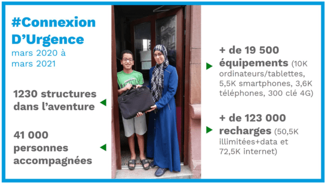 Emmaüs Connect poursuit la mission qu’il a lancée il y a un an, au début du confinement, lorsqu’il a orienté son aide vers les familles avec de jeunes enfants : les personnes vulnérables, exclues du numérique, vivaient d’autant plus l’isolement et le manque de moyens matériels que les familles devaient pratiquer l’enseignement à distance. Avec Connexion d’urgence, le réseau a permis de collecter et distribuer des équipements (ordinateurs, smartphones, tablettes, téléphones) et des moyens de connexion (recharges prépayées mobile/internet) pour les jeunes en décrochage scolaire et les publics en grande précarité.