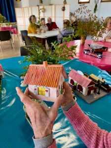 Dans cette équipe, Patricia, ancienne aide-soignante à l’esprit très créatif, a proposé il y a quelques mois de réaliser un village en modèle réduit. C’est parti, chacun s’est mis à découper, à coller, à peindre, à colorier : des maisons, une gare, une école, une église, un château…ont vu le jour, et ce n’est pas fini. Des malades, aidés de bénévoles, vont confectionner une piscine, une mairie, des animaux, des fleurs. Les gestes sont moins sûrs mais chacun s’applique et prend plaisir à créer. « La halte relais est une très belle aventure, un incroyable espace pour parler, rire, s’amuser, créer du lien », souligne Michèle.