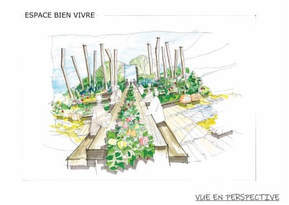 Dans ce jardin du « Bon Vivant » sélectionné pour la finale du Carré des Jardiniers, la filière bois locale est particulièrement mise à l’honneur ; châtaigniers périgourdins structurent la canopée, arche inaugurale de l’espace bien vivre, avec une table en chêne de 7 mètres ; table du partage et de la convivialité, creusée par un chemin végétal offrant plantes gourmandes et autres aromatiques locales. Un espace bien-être, bordé d’une forêt luxuriante structurée autour d’une table d’eau, révèle des cocons organiques de relaxation en châtaignier.