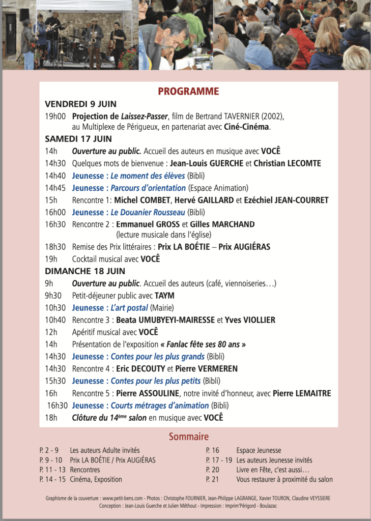 Six rendez-vous répartis sur les deux jours seront l’occasion d’aborder « La nouvelle histoire du Périgord », à travers l’ouvrage de Michel COMBET, Hervé GAILLARD et Ézéchiel JEAN-COURRET, l’odyssée syrienne de Taym, mais aussi de questionner le passé colonial avec Beata UMUBYEYI-MAIRESSE et Yves VIOLLIER, et la nostalgie des 70’s avec Éric DECOUTY et Pierre VERMEREN. Le parcours de journaliste et d’écrivain de Pierre ASSOULINE sera évoqué avec son ami Pierre LEMAÎTRE, sous la férule d’Olivier MONY.