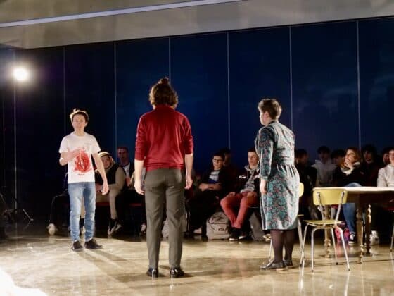 Invités à prendre place autour du plateau, comme dans une arène, mais en plus intime, les lycéens ont expérimenté une forme de théâtre dans lequel le spectateur s’intègre dans la pièce. Son rythme (respiration, soupirs, gêne) s’agrège avec celui des comédiens. Partie prenante de la pièce grâce à une scène élargie, il se situe dans un même espace, au centre duquel les protagonistes s’affrontent. Le décor minimaliste (une table et trois chaises), la convergence des regards des spectateurs, la multiplicité des plans larges et serrés, grâce aux va-et-vient fréquents sur le plateau et dans les angles, renforcent cet échange indicible entre comédiens et spectateurs.