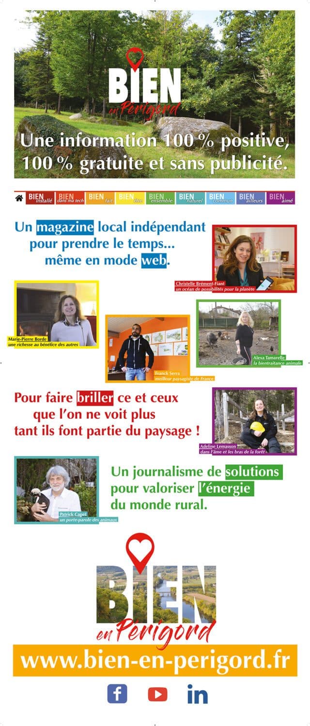 BIEN en Périgord a émergé après une période secouée par la crise sanitaire et les inquiétudes économiques. Un an plus tard, la situation empire encore avec une guerre qui met le monde entier sous tension, comme si le virus n’avait pas suffi. Dans ce terrible climat international, nous continuons à croire et à porter, plus que jamais, une information positive de proximité, des valeurs humanistes, d’entraide, de bienveillance et des solutions pour le bien commun et le vivre ensemble.