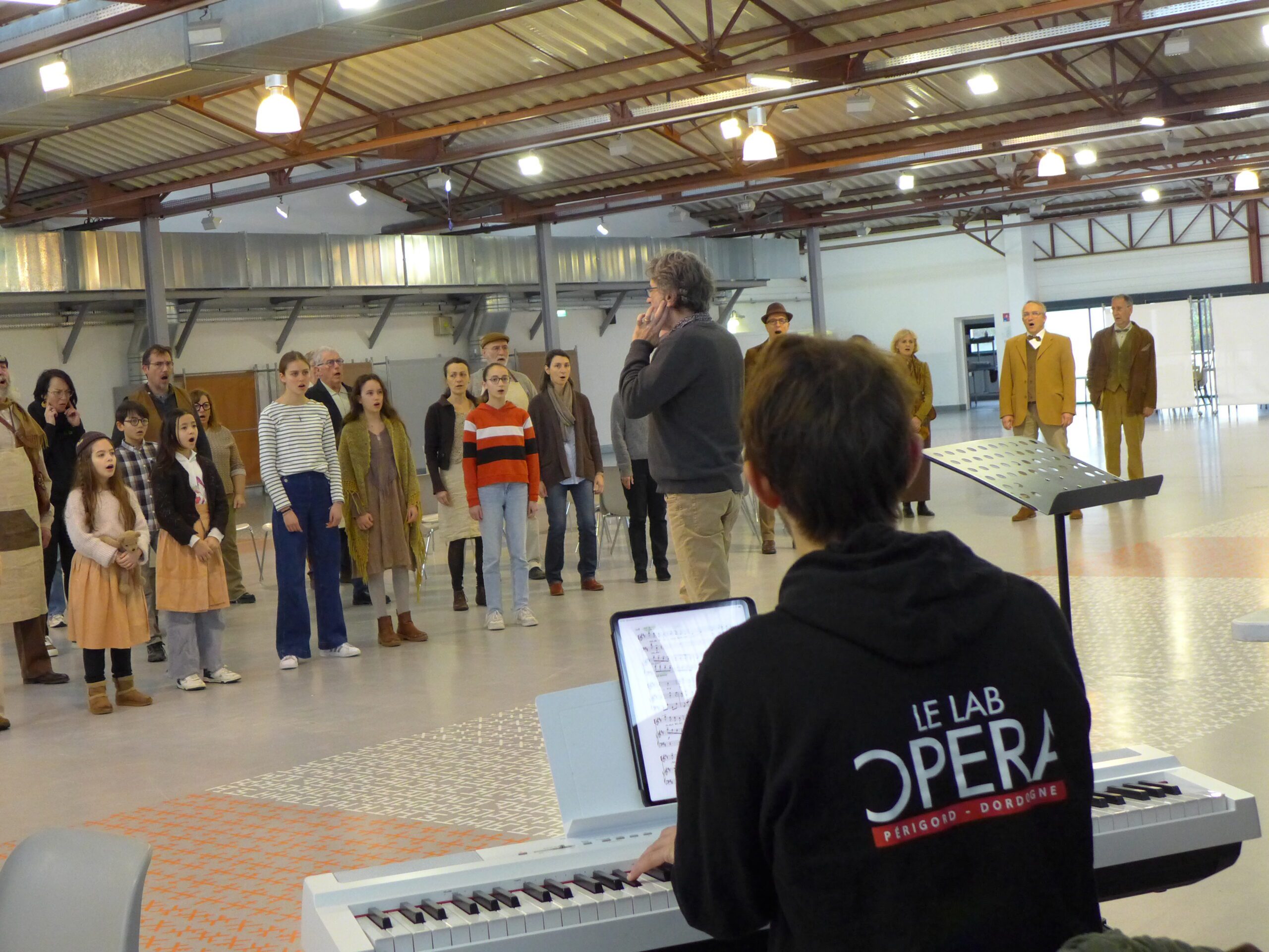 Dans deux salles de la Filature de l’Isle à Périgueux, bien au chaud, les répétitions commencent à ressembler au futur spectacle. D’un côté, sous la baguette exigeante de la cheffe Chloé Meyzie, l’orchestre travaille inlassablement les moindres détails de la musique de Puccini. De l’autre, en suivant les indications bienveillantes de la metteuse en scène Gersende Michel et du chef de chœur Jean-François Bulart, les choristes et comédiens ont commencé à jouer en habits de fin du XIXe siècle, préparés par la costumière Axelle Nicotera-Dufraisse. En attendant les décors de scène, ils se contentent de l’univers métallique de l’ancienne usine textile et de chaises en plastique pour délimiter les espaces. Après plusieurs mois de répétitions progressives, ils ont la pièce dans la tête. Ils seront prêts pour les représentations des 25 et 26 avril.