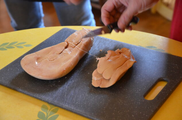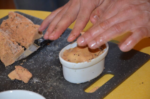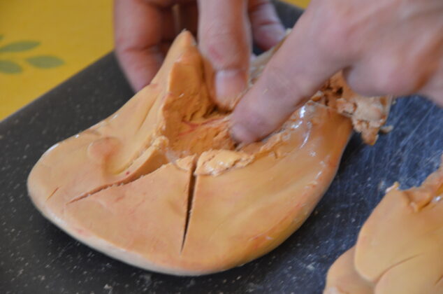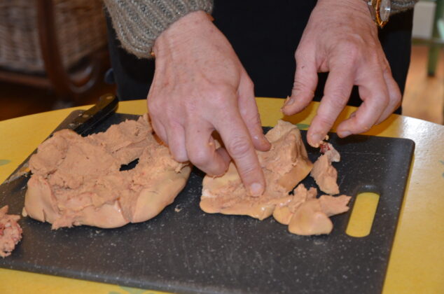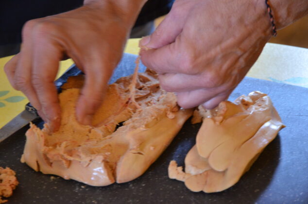 Dans l’ordre, il faut séparer les deux lobes. Le plus gros sera incisé en forme de Y pour retirer la grosse veine qui a cette forme. Dans le plus petit, les veines sont plus discrètes, mais se trouvent au toucher. Une fois que l’essentiel des vaisseaux est enlevé, les foies se retrouvent un peu explosés, mais seront reconstitués en les tassant dans leur terrine. Auparavant, ne pas oublier de les assaisonner avec du sel et du poivre, voire un peu de monbazillac ou de cognac selon le goût.
