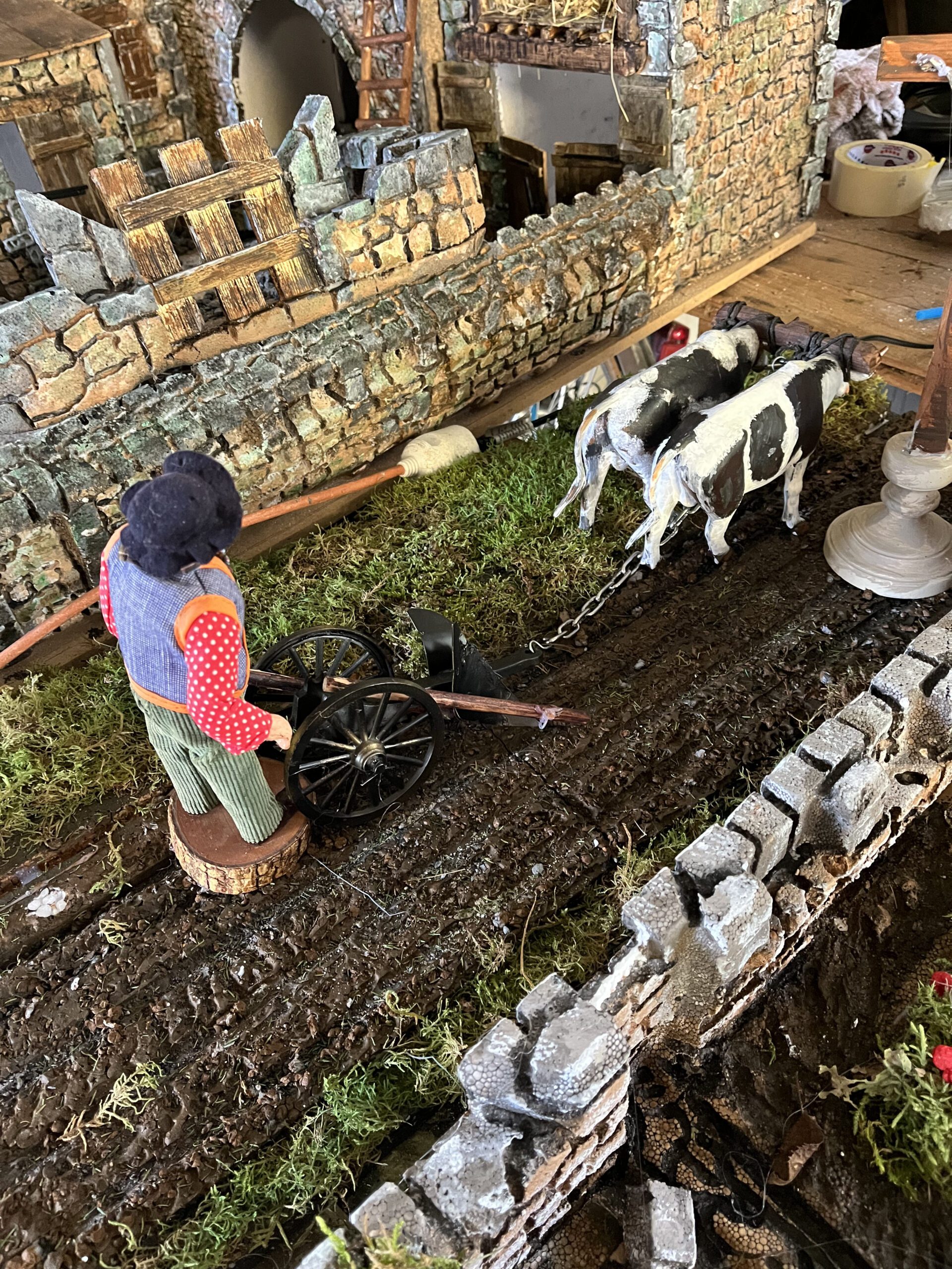 Les objets et les santons ont été glanés au fil du temps, sur les brocantes, les vide-greniers, et sur les sites de seconde main. Cette économie du réemploi fait aussi partie de l’esprit de Jean-Claude. Mais il sait également fabriquer de ses mains : de petites charrettes, par exemple, nées de presque rien. « J’espère apporter quelque chose aux gens qui vont voir mon travail », confie-t-il avec émotion.