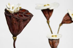 Les gestes de création se côtoient sans se ressembler : « couper, tresser, filer, assembler, dessiner, meuler, mouler, sculpter, tourner, caresser, gratter, sceller, pincer, imprimer, ajuster »… De quoi susciter des sensations elles aussi très diverses : « odeurs, douceur, rugosité, brillance, transparence, éclat, satiné, reflets, brut, soyeux »… La profusion de matières invite elle aussi à la curiosité : « pierre, terre, osier, lin, hortensia, pavots, verre, plume, kaolin, érable, châtaignier, merisier, laiton, or, cuir, papier, pierre, laine »…