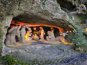 L’an dernier, la décision avait été prise un peu au dernier moment, selon les mots de Nathalie Bapts. « Cette année nous avons eu le temps de nous organiser un peu mieux », note-t-elle. Et, chacun des sites touristiques a créé sa crèche en fonction de son identité. Au gouffre de Proumeyssac, par exemple, c’est un mapping qui a lieu pendant la visite, sur les parois de la Cathédrale de Cristal. Aux Milandes et à Marqueyssac, les chapelles, ouvertes au public, proposent une crèche plus traditionnelle. Celles de la Roque Saint-Christophe et du Roc de Cazelle, elles, sont quasiment à l’échelle 1/1. Le château de Castelnaud, est, depuis longtemps, un habitué des expositions Playmobil. C’est donc naturellement que les petits personnages ont investi la crèche.