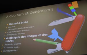 « L’IA ne comprend pas, mais elle calcule » note d’emblée l’experte. Elle invente aussi… alimentée par ses réseaux de neurones (Large Language Model) qui prélèvent de tout un peu partout. On peut dire qu’elle a une certaine forme d’intelligence (et il faut à ce titre se débarrasser d’emblée du malentendu quant à son nom, fruit d’une mauvaise traduction car intelligence en anglais, comme pour CIA, désigne le renseignement…Guillaume Grall, directeur de Digital Valley, insiste sur ce point) dans sa version générative, capable d’écrire des courriers, des devis, des posts pour les réseaux, de répondre à des questions, de fabriquer des images et des vidéos.