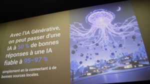 « L’IA ne comprend pas, mais elle calcule » note d’emblée l’experte. Elle invente aussi… alimentée par ses réseaux de neurones (Large Language Model) qui prélèvent de tout un peu partout. On peut dire qu’elle a une certaine forme d’intelligence (et il faut à ce titre se débarrasser d’emblée du malentendu quant à son nom, fruit d’une mauvaise traduction car intelligence en anglais, comme pour CIA, désigne le renseignement…Guillaume Grall, directeur de Digital Valley, insiste sur ce point) dans sa version générative, capable d’écrire des courriers, des devis, des posts pour les réseaux, de répondre à des questions, de fabriquer des images et des vidéos.