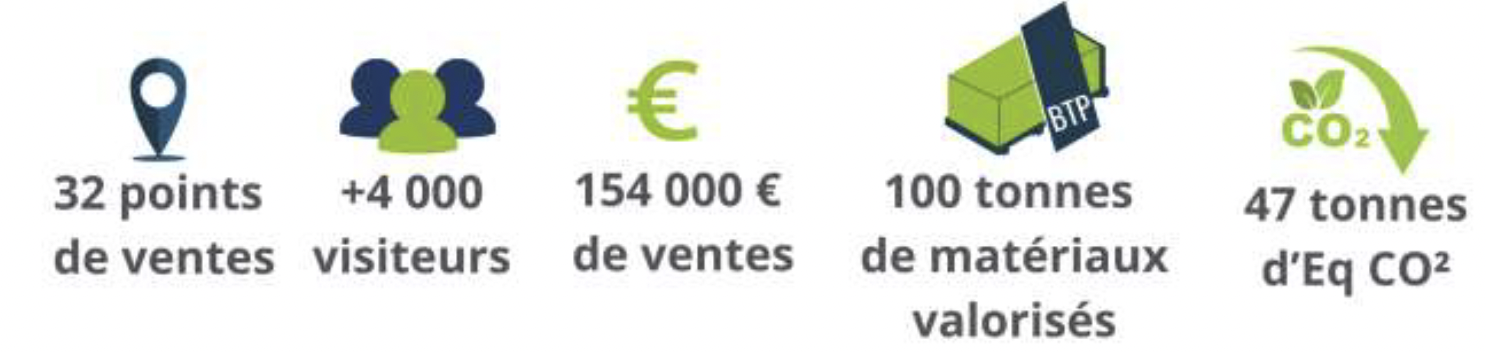 Les résultats chiffrés des deux premières éditions (ci-dessus) font notamment apparaître 100 tonnes de matériaux valorisés, soit 23 A/R Paris – New York en avion (47 tonnes d’équivalent CO2 évités).