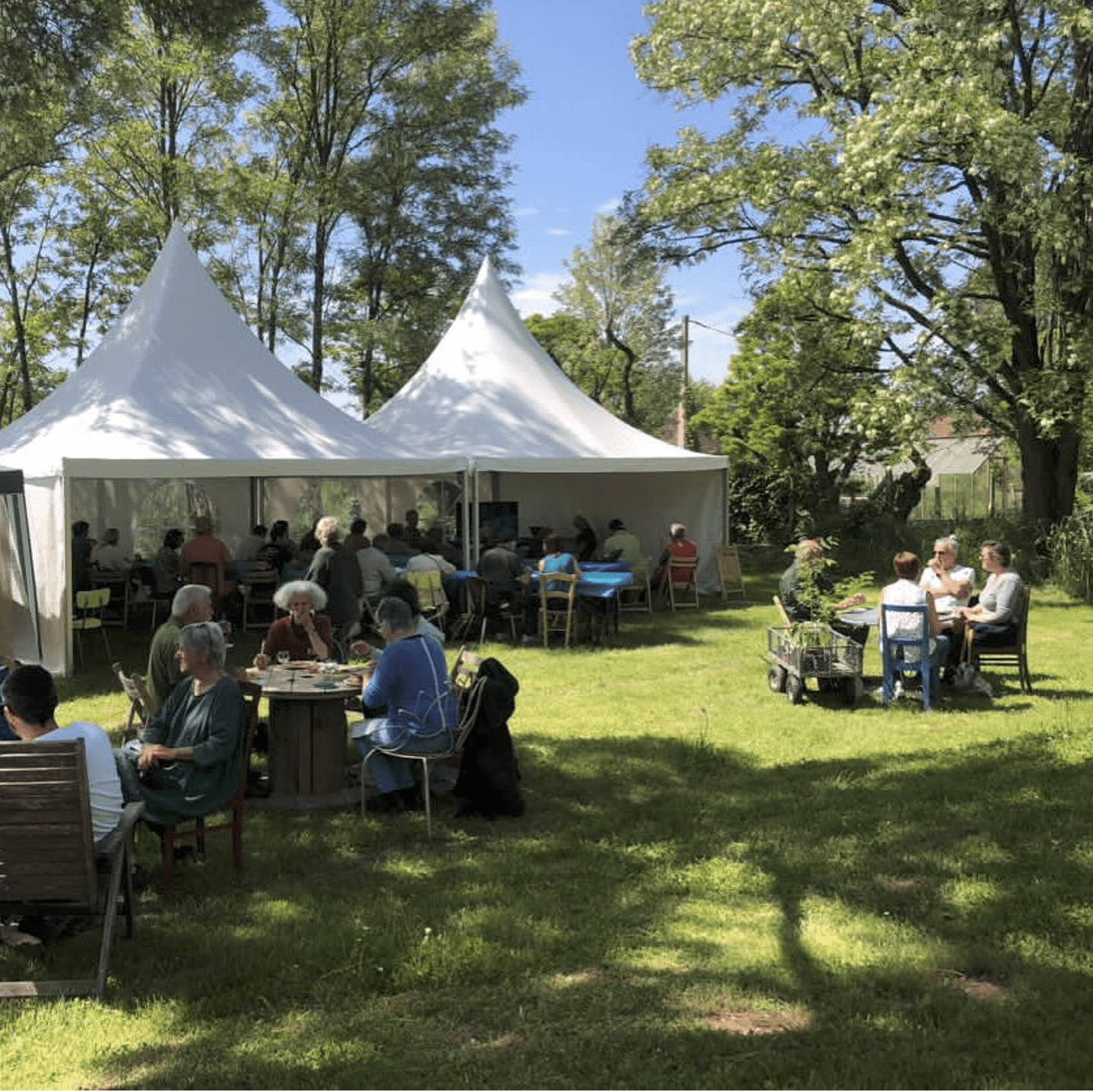 Grâce à Marie Michel et son concept de restauration Aux Carreaux, la cuisine fleurie, la restauration sera assurée durant les deux jours. Au menu : du canard du Périgord (qui a couru !) accompagné de légumes frais et de fleurs de saison. Les tablées sont installées sous les arbres du domaine.