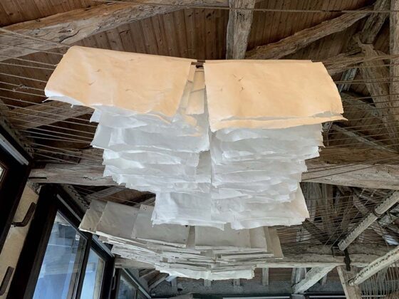 Les formes étaient trempées dans des cuves de pâte par les ouvreurs pour y récupérer les fines particules, opération répétée en fonction du grammage souhaité (épaisseur finale du papier). Couchée puis essorée, chaque feuille est séchée et placée entre des carrés de feutres sur plusieurs couches. Enfin, une fois pressées, les feuilles étaient disposées sur des étendoirs pour que l’eau s’évapore. Le séchoir, traversé par une multitude de cordages qui recevaient des feuilles, fonctionnait avec des volets qu’on ouvrait et fermait pour contrôler les courants d’air et la luminosité.