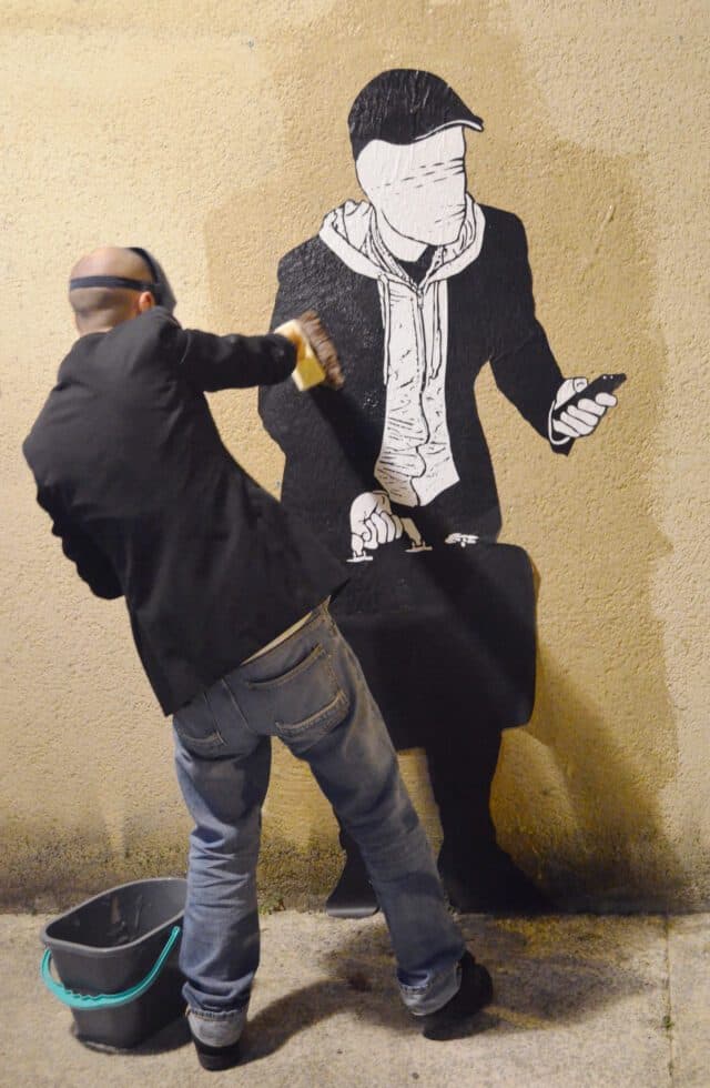 Il avance masqué dans nos rues et ses fidèles jouent le jeu voulu par celui qui distingue sa vie de travailleur social (il est tombé dedans petit car ses parents sont bien connus dans cette sphère, où il est en passe d’évoluer puisqu’il reprend ses études pour y devenir cadre) et sa démarche artistique. Les deux engagements se rejoignent. Bob Cougar ne manque pas de surgir au détour d’une crise pour nous rappeler à notre humanité : ses collages ont ainsi mis à distance l’angoisse générée par le confinement et rappelé le sort de femmes alors prisonnières de leurs bourreaux.