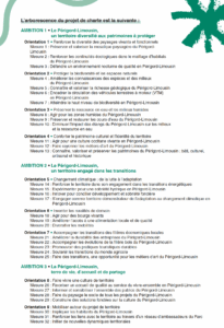 Le Parc propose une trajectoire autour de trois grandes ambitions interconnectées, déclinées elles-mêmes en 9 orientations et 32 mesures pour une période de 15 ans. Première priorité : mieux connaître, protéger et restaurer les richesses naturelles et culturelles de ce territoire reconnu pour la qualité de ses paysages, de ses milieux naturels et ressources, et pour son identité culturelle.
