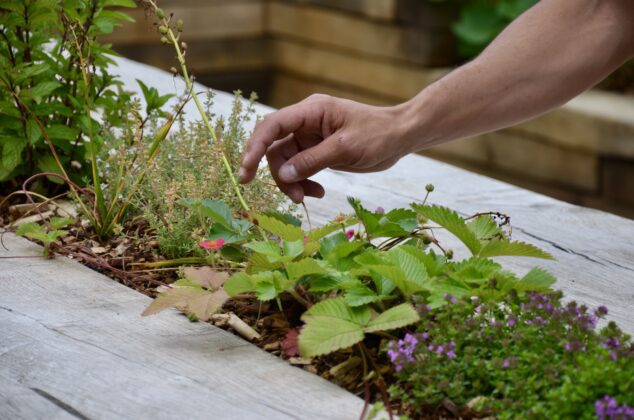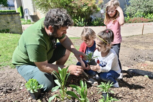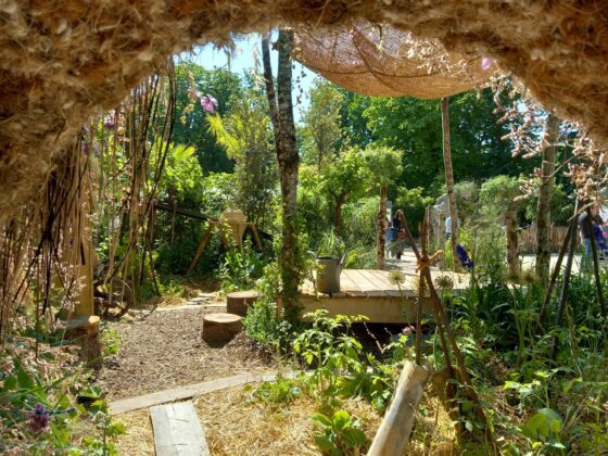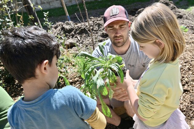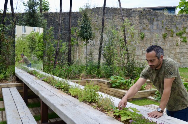 Dans la conception et la création de jardins, et tout particulièrement pour Human & Sens, Franck ne perd jamais de vue son objectif principal ; affirmer une identité forte en utilisant des matières de notre territoire, avant d’aller les chercher ailleurs. Human & Sens demeurera le messager de notre territoire, par la valorisation de la filière bois locale, omniprésente, à la fois dans la structuration de la canopée, de la table nourricière et des cocons de relaxation. Dans sa volonté de toucher tous les publics, Franck Serra a pu compter sur les élèves de l’école du Lys, qui ont participé à la plantation du potager et à celle de la table nourricière. Une découverte inédite pour certains d’entre eux.