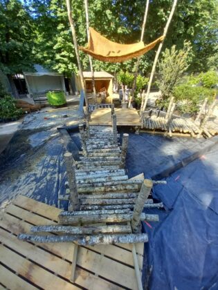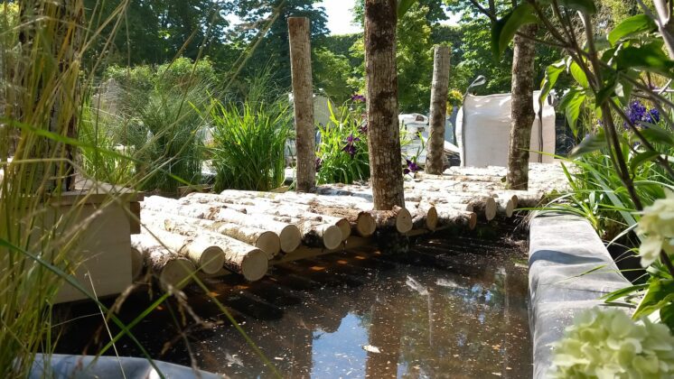Dans sa démarche de création de la Fée Demoiselle, le maître jardinier a souhaité recourir à des matières simples, comme le châtaignier brut, issu de sa forêt et utilisé sur les pontons traversant la mare. L’idée étant d’intégrer le jardin dans la nature sans la dégrader.