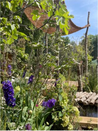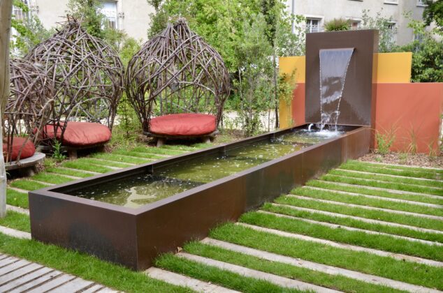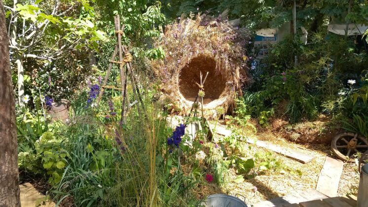 Grand prix de la création paysagère, le jardin Fée Demoiselle, en partenariat avec le champagne Demoiselle Vranken, s’appuie sur la ressource en eau, « un sujet majeur, insiste Franck Serra, qui nous amène à réfléchir différemment ». S’inspirant des jardins de nos grands-parents qui avaient de bonnes pratiques simples, on retrouve une cabane avec des tôles, récupérant les eaux de pluie afin de les amener vers une mare. Cette eau tombée du ciel sera réemployée en circuit court et sans traitement, au profit des plantes ou des légumes en devenir. Un clin d’œil à sa grand-mère pour laquelle l’eau constituait une ressource précieuse.