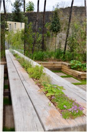 « C’est un jardin poétique, précise Franck Serra, car on est dans un jardin immersif, comme dans un cocon, pas pollué de l’extérieur, mais pas non plus totalement fermé, puisque dégagé sur une façade pour donner envie d’y pénétrer. » Un pari réussi, même si le passage sur les pontons, constitués de rondins de différents diamètres pouvait être inconfortable, il n’a pas dissuadé les visiteurs, sollicitant ainsi leur sens de l’observation. Vivaces, végétaux champêtres, chênes, charmes, cornouillers, fusains de bois, composent une mise en scène harmonieuse, où les camaïeus couleur champagne suscitent l’émotion.