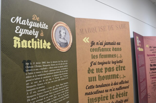 Avec l’évocation de la cause des femmes, la figure de Rachilde ressort de l’oubli où elle se maintenait, y compris sur sa terre natale. Ce monstre sacré de la littérature de la Belle Époque, fin XIXe, certes moins connue que George Sand (elle naît 16 ans avant la disparition de la dame de Nohant), n’est pas moins scandaleuse et a produit une œuvre abondante dont la médiathèque de Périgueux détient une belle part, avec plus de 170 ouvrages imprimés conservés, dont un grand nombre d’éditions originales en tirage de tête de ses romans, mais aussi des manuscrits et de nombreuses archives. « Cette collection fait de Rachilde, le quatrième auteur de Dordogne le mieux représenté dans le fonds Périgord — après Léon Bloy, Montaigne et Eugène Le Roy — et sa première autrice », peut-on lire.