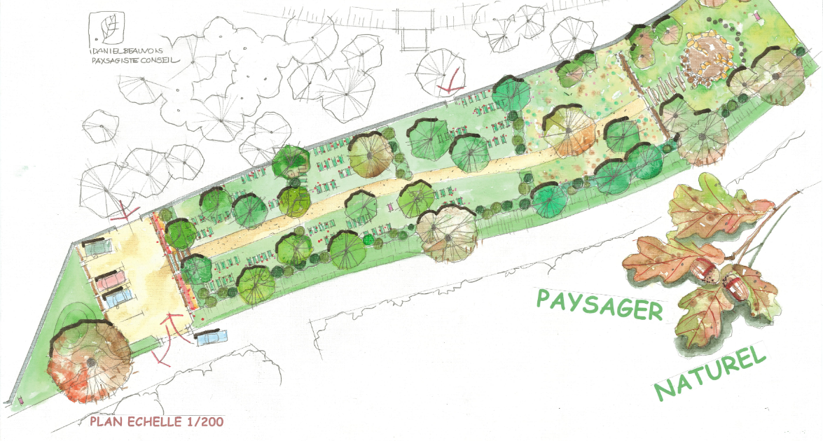Ce cimetière animalier s’inscrit dans une démarche écologique, il privilégie une intégration douce dans le paysage en conservant les essences existantes (chênes, charmes, noisetiers) associées à des plantations locales (sorbier, cornouiller) pour favoriser la biodiversité et créer un refuge pour la faune. Les eaux pluviales vont bénéficier de solutions naturelles pour capter et filtrer les ruissellements, limiter l’impact sur les sols. Les matériaux sont choisis dans une logique d’économie circulaire, avec des enrobés recyclés et castine issue de chantiers de désimperméabilisation, et du bois local.