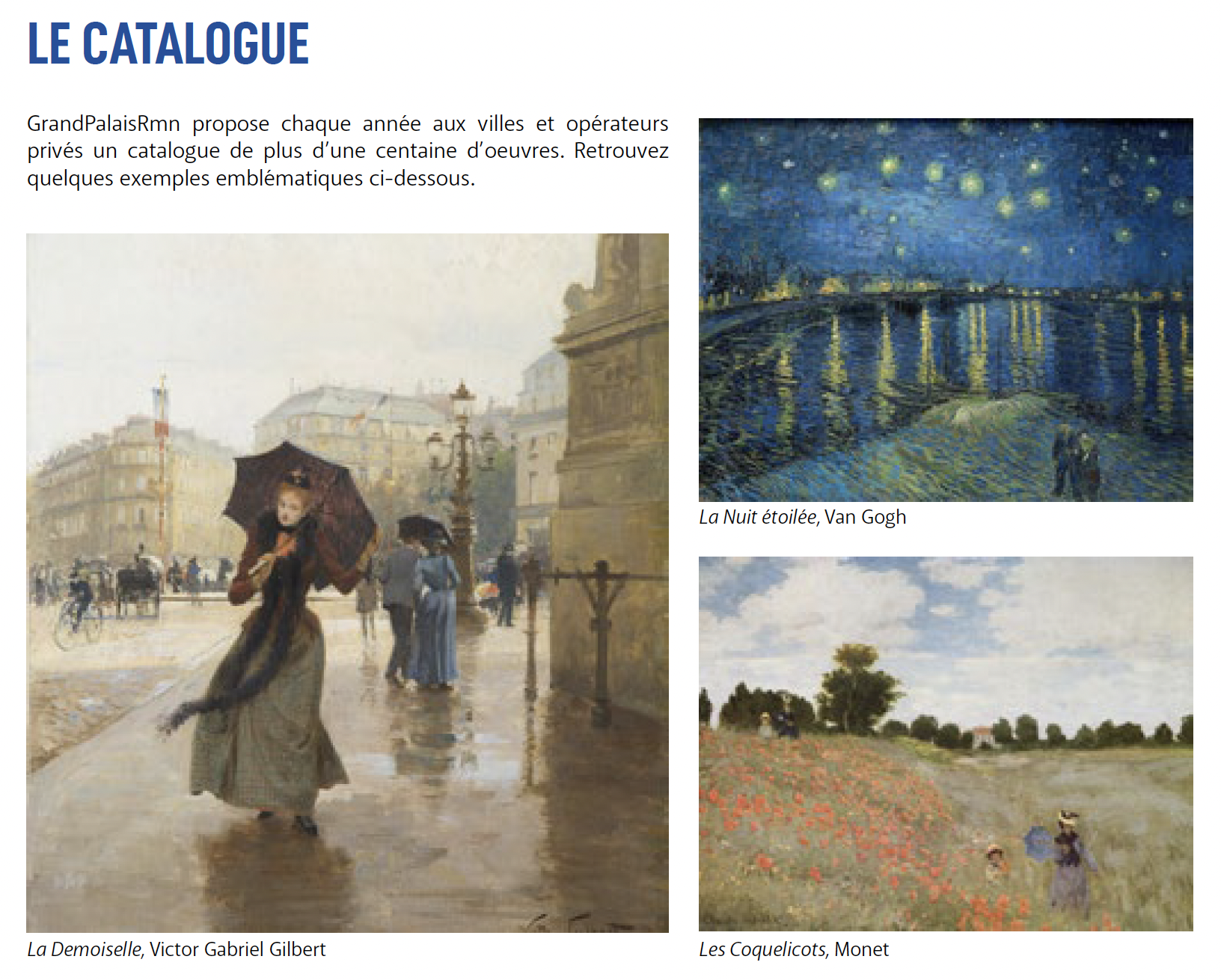 Le partenariat inédit avec le GrandPalaisRmn permet de faire circuler les vues d’une centaine d’œuvres des plus grands maîtres, présents dans les musées nationaux. La sélection, sur le thème du paysage, a été proposée aux communes et acteurs privés engagés dans l’opération que l’institution accompagne en accordant le droit de reproduire ces œuvres à des coûts « drastiquement réduit ». Les collectivités et structures sont ensuite libres de les afficher partout où cela est possible : emplacements publicitaires, abribus, transports en commun, vitrines de magasins, frontons de bâtiments publics, grilles de jardins ou bâches de chantiers.