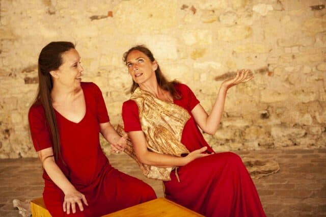 Jany Pons Ballester assure le chant lyrique a capella et le récit tandis que Nancy Boissel danse le fil du spectacle. Catherine Lippinois a conçu les sublimes pectoraux qui ornent les intervenantes, conceptrice d’œuvres de plumes en terre, des lichens et de plantes, de baies, de vesses de loup, de traces naturelles ou organiques portant l’humanité tout entière. Conçu sur la trame des prières qui rythment la journée, des vigiles nocturnes aux complies, en passant par les laudes et les vêpres, le voyage spirituel guidé par la force d’Hildegarde de Bingen accompagne le public jusqu’à la nuit noire du 14 avril 2013 lors de laquelle disparaît la dernière Béguine.