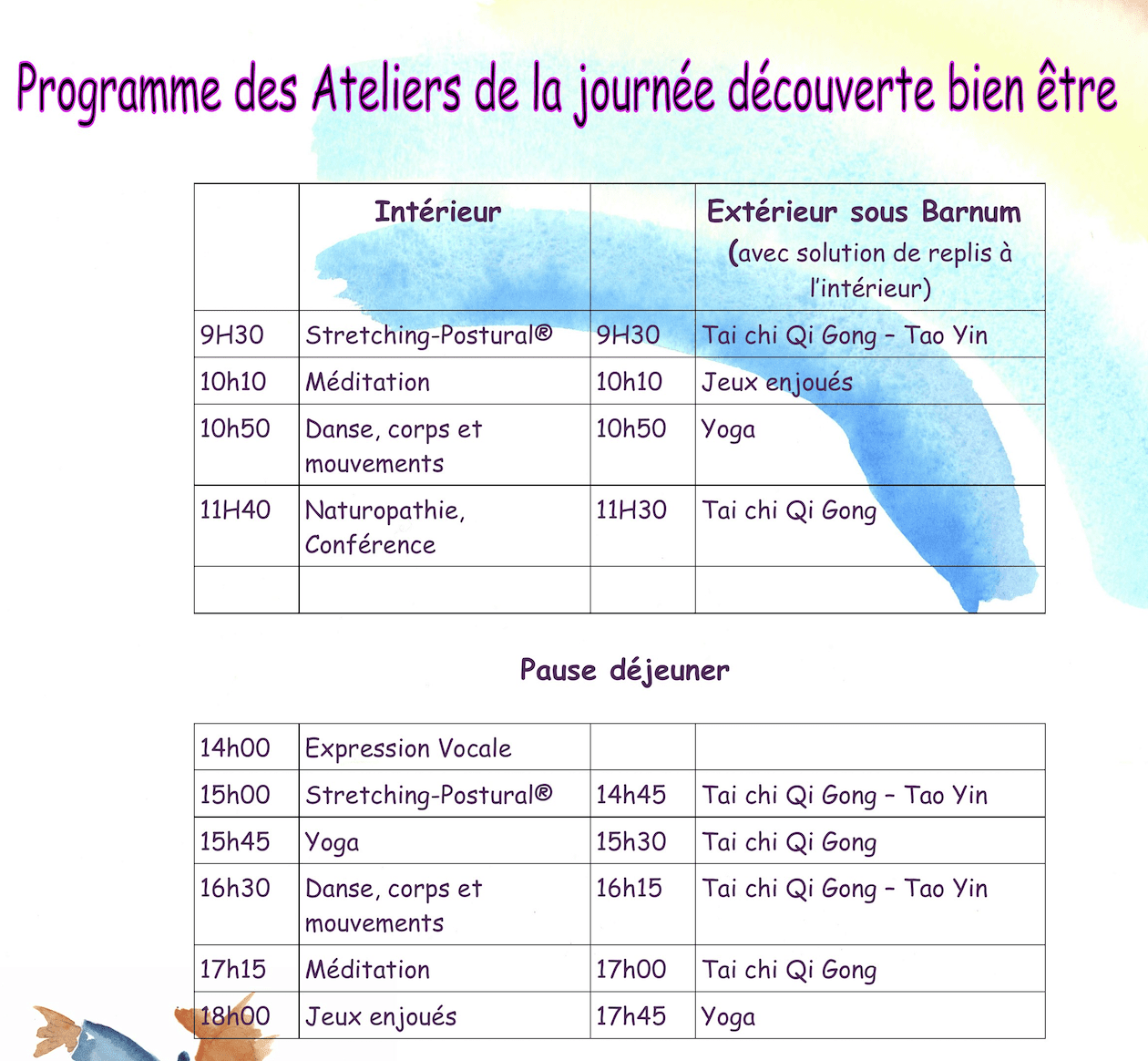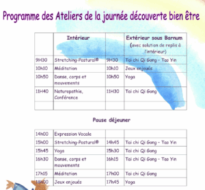 Cette journée présente l’avantage d’aller à leur rencontre en un même lieu, moyennant une modique participation pour les ateliers et les soins individuels. L’initiation se fera par des ateliers collectifs, moments de partage et de pratiques corporelles ; des séances individuelles, pour une rencontre avec des praticiens locaux (séances de 30mn – inscriptions sur place). Des moments de convivialité sont prévus tout au long de la journée, repas sain, tisanerie, délices végétaux, café, pâtisserie… pour favoriser le lien avec les visiteurs. « Notre objectif est d’offrir une parenthèse de douceur où chacun peut repartir avec des clés pour un quotidien plus serein et inspiré », assurent les organisatrices.