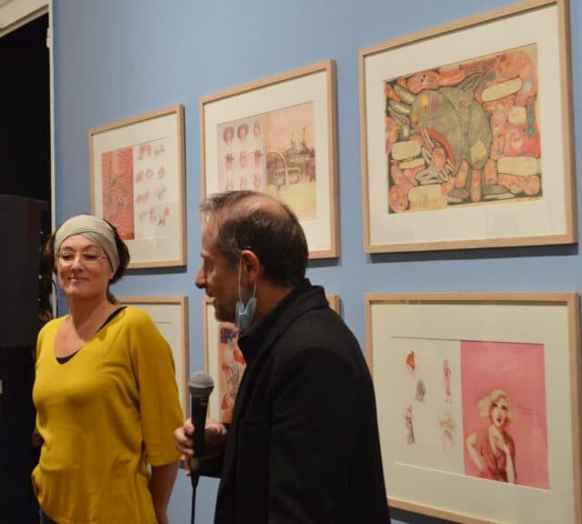 C’est un émerveillement qui va durer jusqu’à Noël et un peu plus. Une exposition inédite, constellation délicate qui fait briller le travail de Rébecca Dautremer sous quelques-unes de ses nombreuses facettes, sélection faite dans sa bibliographie récente : Des souris et des hommes, roman graphique mettant en images l’œuvre de Steinbeck dans sa quasi-totalité pour révéler les personnages dans leur humanité malmenée, planter des décors que l’auteur décrit pourtant à peine et s’amuser avec de délirantes petites surprises, Le Bois dormait, Cavale, Midi pile, Jacominus… ou plus ancienne, comme Babayaga (2003). Tout un univers dédié à la jeunesse, pour mieux éblouir les grands enfants que nous restons. La créativité de l’illustratrice va bien au-delà des albums qu’elle publie depuis vingt ans puisque son talent porte jusqu’au cinéma, avec le film d’animation Kerity, la maison des contes (2009), et jusqu’à la scène, avec le spectacle Jacominus et moi – La conférence ébouriffée, présenté lors du Festival BD en Périgord à Bassillac-et-Auberoche.